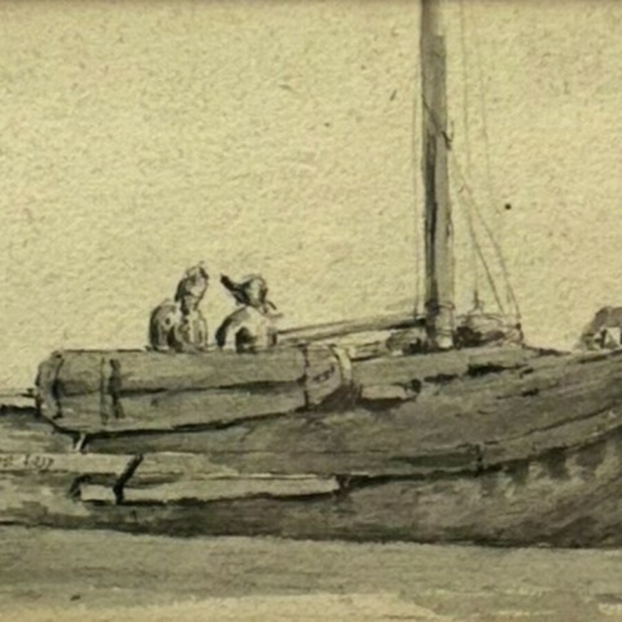 Aquarel in grijstinten, schets van een zeilschip. Linksonder gesigneerd Albert van Beest (Rotterdam 1820 – New York 1860), gedateerd 1837