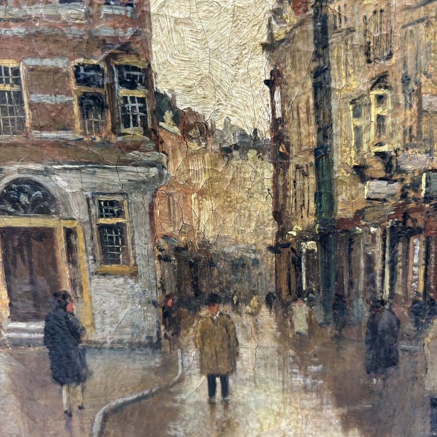 Schilderij, olieverf op doek. Straatgezicht Noordeinde Den Haag met wandelende figuren. Linksonder gesigneerd Leo Grijseels (1884-1966).