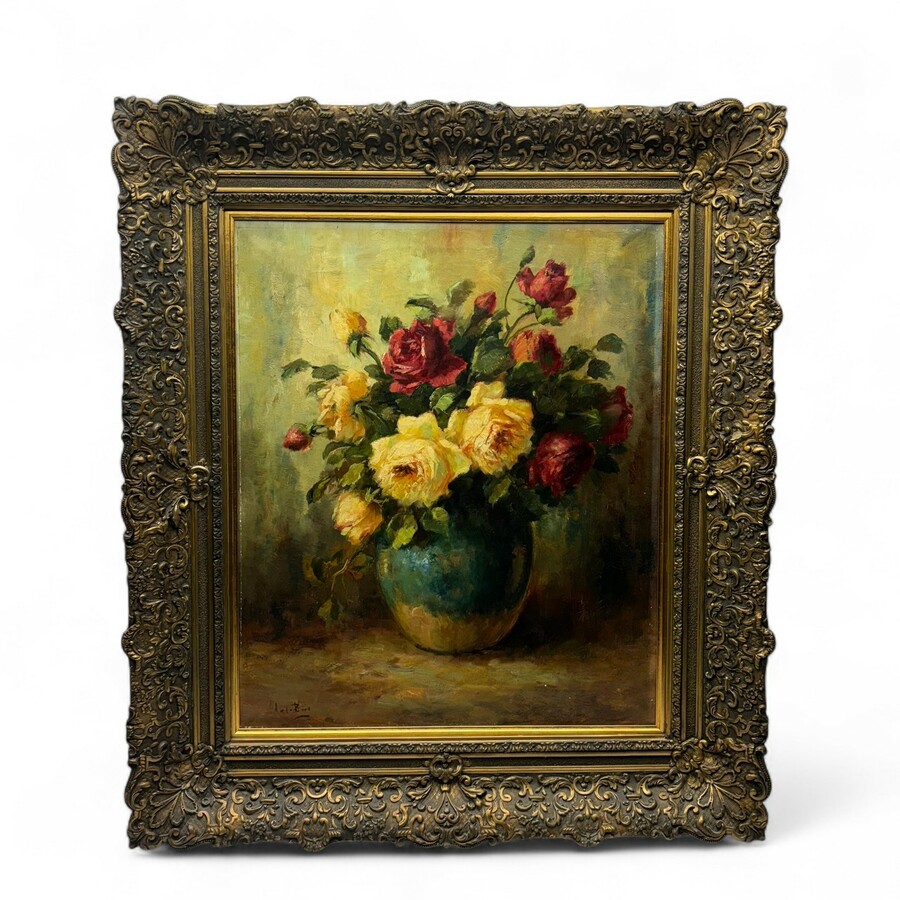 Schilderij, olieverf op doek. Stilleven met rozen in een gemberpot. Linksonder gesigneerd A. v.d. Berg, Nederlands 20e eeuw. In gipsen ornamentenlijst.