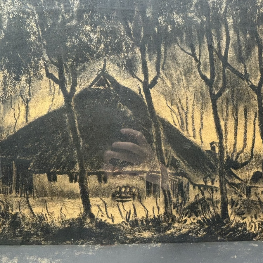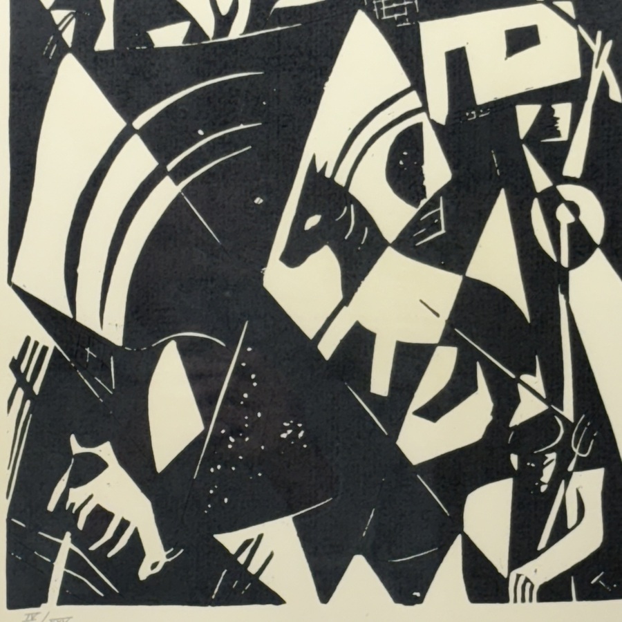 Linosnede op papier, voorstelling van landschap met dieren. Ongesigneerd werk van Tinus van Doorn (Padang, Indonesië 1905 – Ukkel 1940), gelimiteerde postume uitgave door Selma Timmerman, oplage...