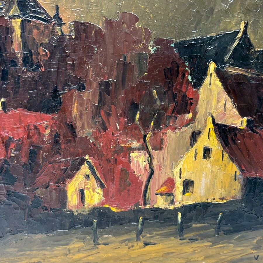 Toeschrijving Jean van Dongen. Schilderij olieverf op board. De kerk te Sprang-Kapelle in Noord Brabant. Gesigneerd Van Dongen 1970.
