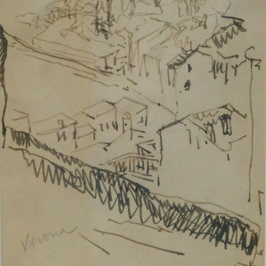 Inkttekening op papier, titel 'Verona'. Toegeschreven aan Johan Dijkstra (Groningen 1896 - 1978). In Gehring lijst.