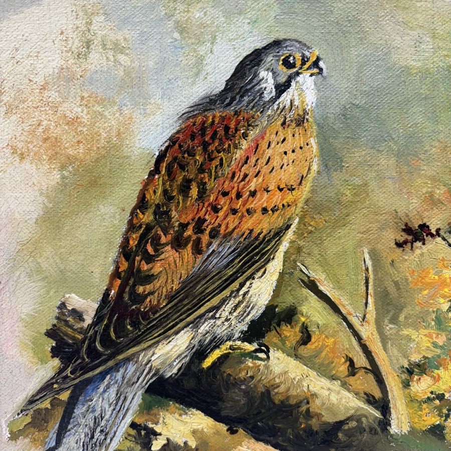 Schilderij, olieverf op board. 'Sperwer op tak', rechtsonder gesigneerd Jo Schrijnder