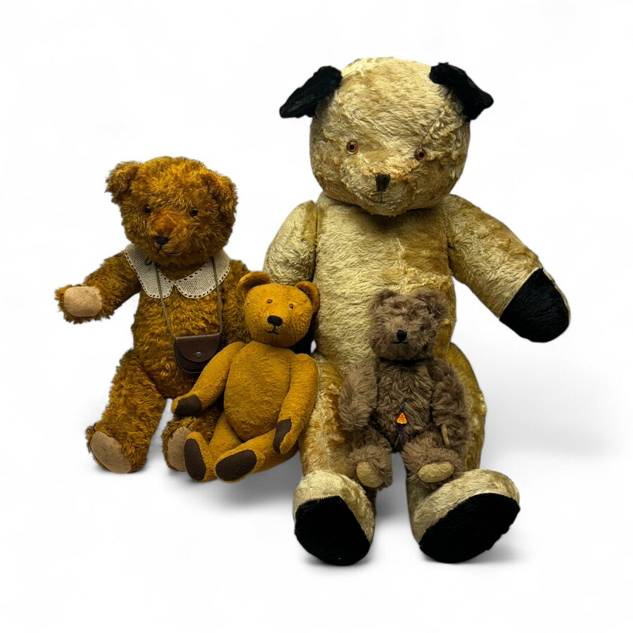 Lot van vier teddyberen, waaronder: hazelnootbruin beertje, gemerkt en uitvoering Clemens, West-Germany, jaren '50/'60, en grote crèmekleurige mohair teddybeer met zwarte oren en voetzooltjes, e...