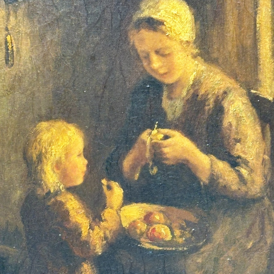 Schilderij, olieverf op doek. Appelschillende boerin met kind. Rechtsonder gesigneerd W. v.d. Berg, eerste helft 20e eeuw.
