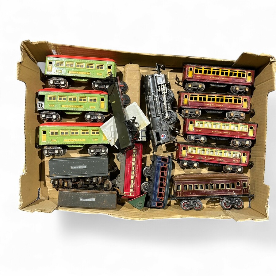 Lot diverse wagons en een locomotief. Divers gemerkt, o.a. 'Lionel Lines' en 'Pullman'. Locomotief ook gemerkt Lionel.