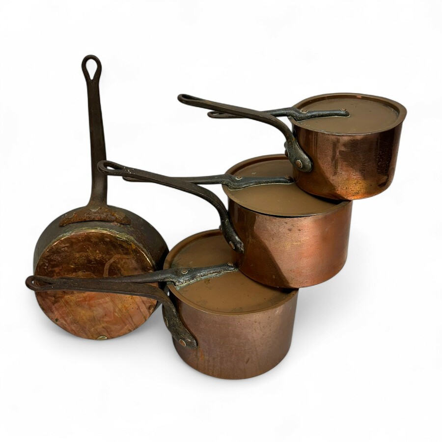 Lot van vier roodkoperen pannen, drie met deksel, allen met smeedijzeren grepen