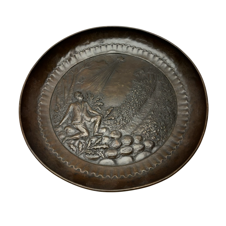 Een antieke 19e of 20e eeuwse gepatineerd roodkoperen schotel, met gedreven decor van man die kijkt naar een ster.