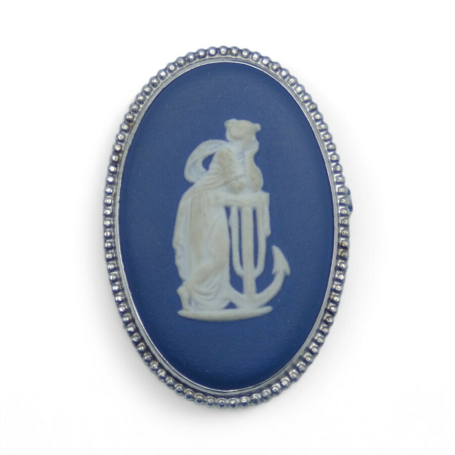 Een 20e eeuwse porseleinen broche, Wedgwood, met zilveren rand.