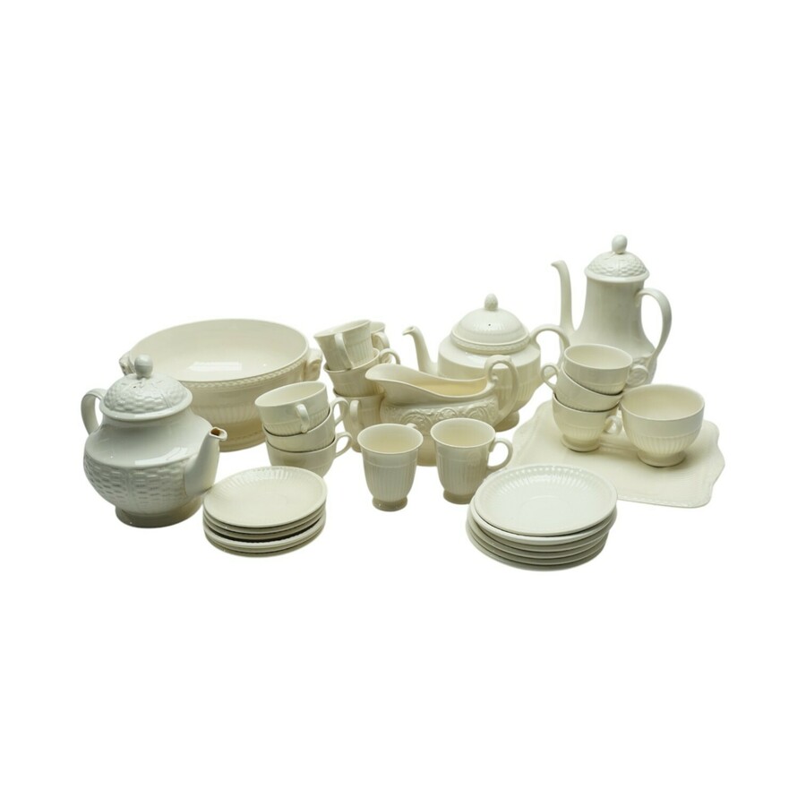 Een deel van een aardewerken koffie en thee servies, bestaande uit een koffie en theepot, kop en schotels en schalen. Patroon oa Willow Weef. Gemerkt Wedgwood.