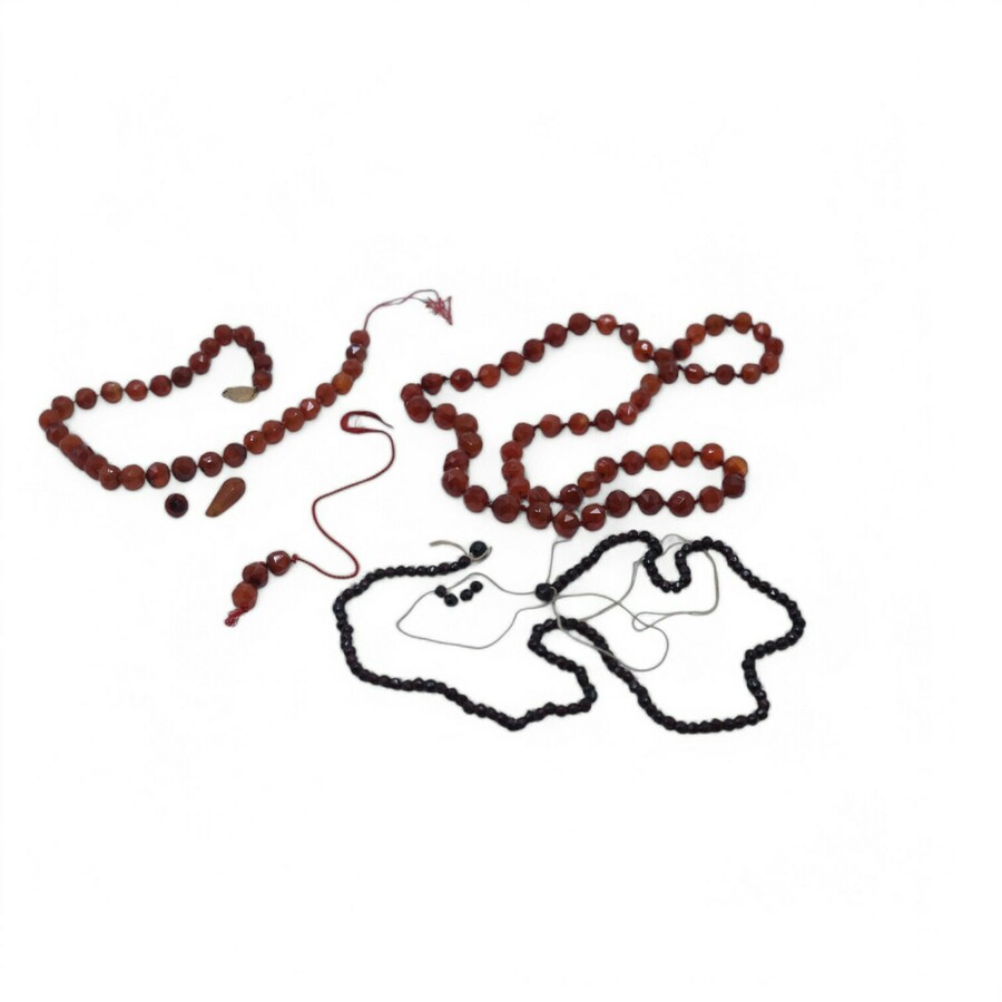 Lot van drie snoeren: een geknoopt carneolen snoer, een carneolen snoer met 14 karaats (585/1000) gegraveerd gouden slotje, en een eenrijig snoer van gefacetteerde glasgranaat, gebroken.