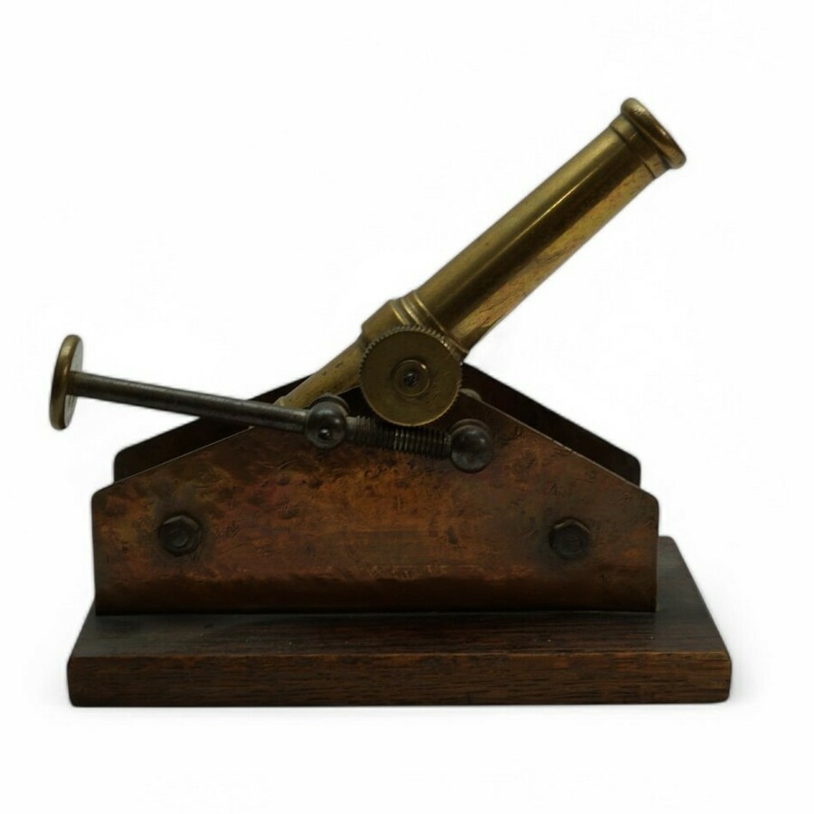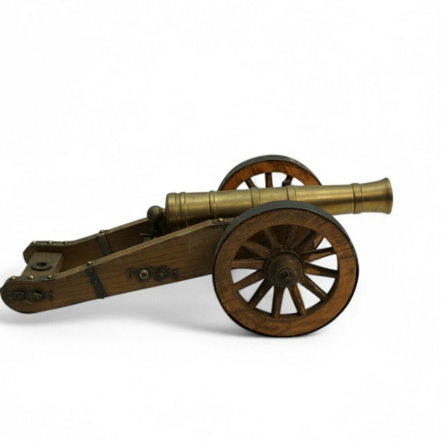 Een 20e eeuwse bronzen tafelkanon op houten voet, met draaimechanisme