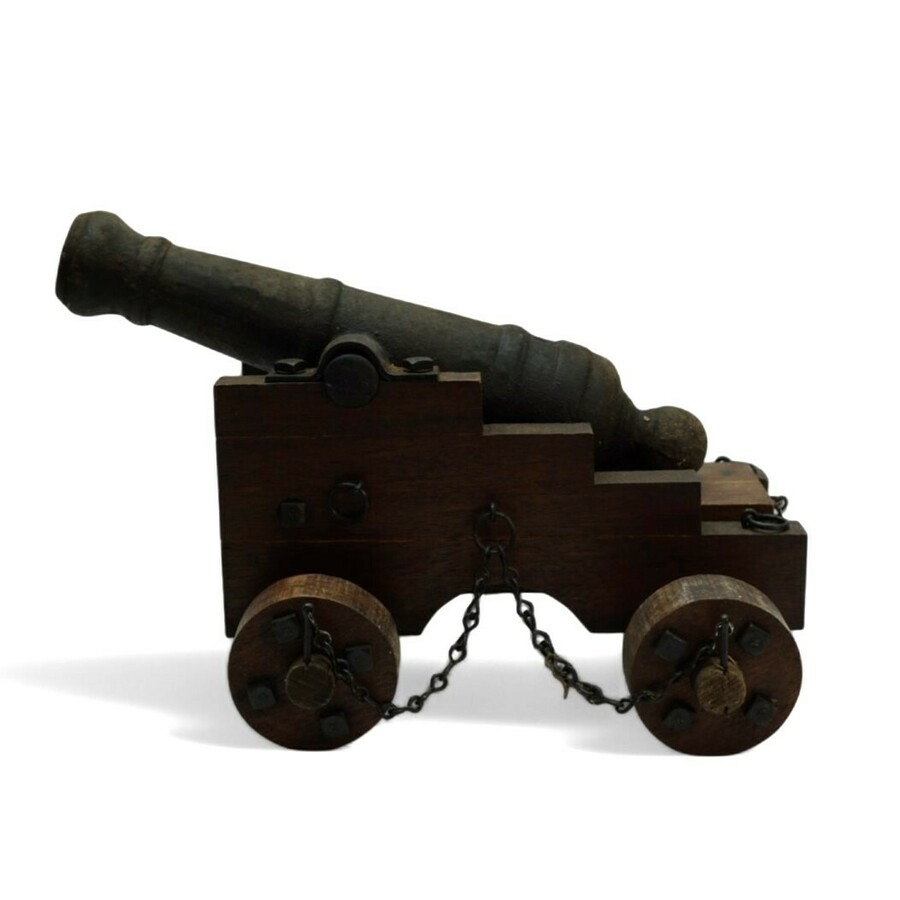 Een 20e eeuws zwart ijzeren tafelkanon op houten onderstel.
