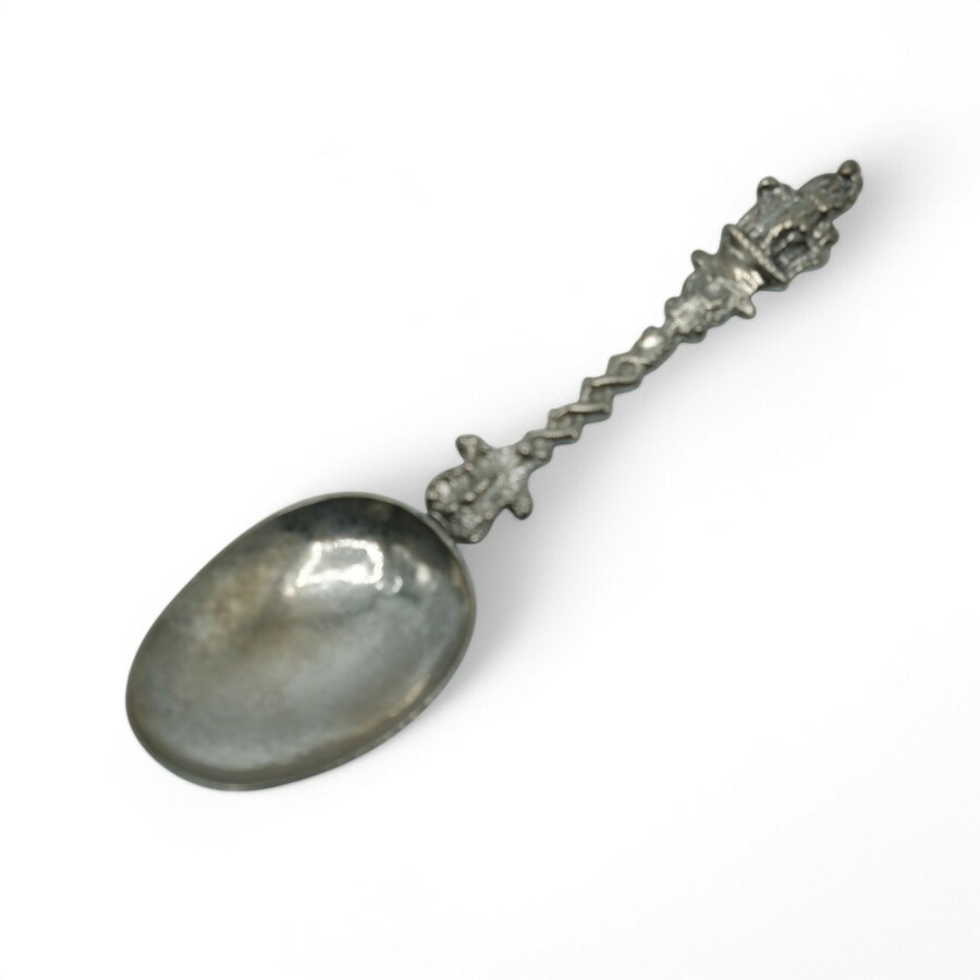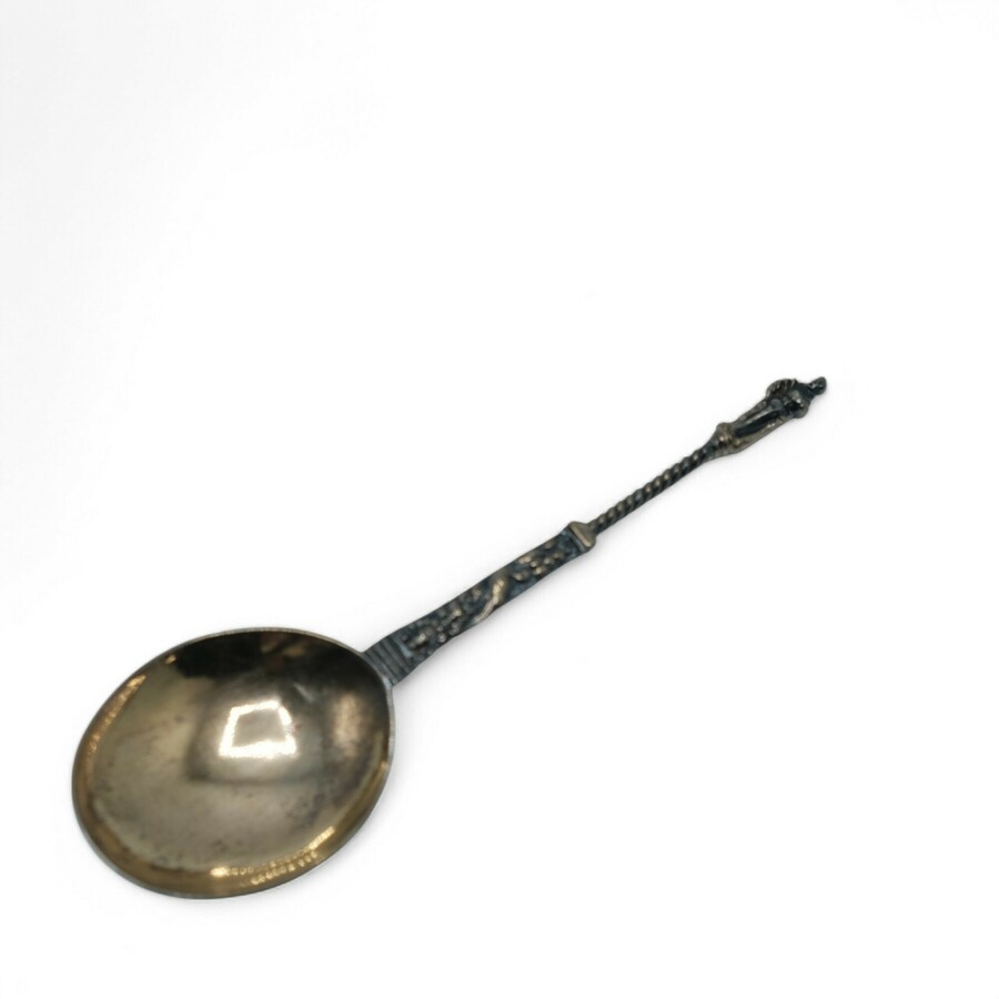 Een antieke verguld zilveren apostellepel, verguld, met getorste steel. Aan de achterzijde gegraveerd met wolf of vos en drie pseudokeuren