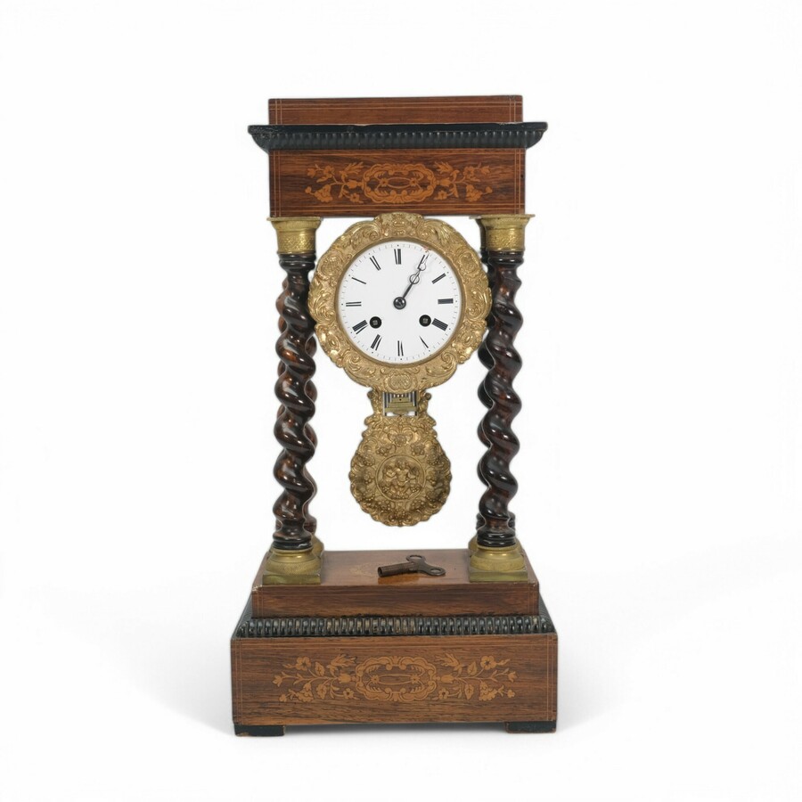 Een antieke 19e eeuwse mahoniehouten kolompendule met getorste pilaren, gedeeltelijk intarsia ingelegd, bronzen ornamentiek en geëmailleeerde wijzerplaat met Romeinse cijferaanduiding. Frankrijk...