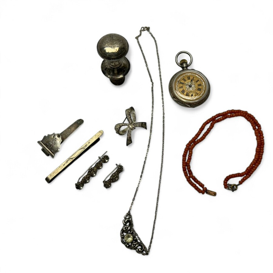 Lot divers, waaronder twee Zeeuwse knop broches, een bloedkoralen armbandje met 14 karaats (585/1000) gouden slot (incompleet) en een antiek 19e eeuws zilveren zakhorloge, gemerkt '800 aan de bi...