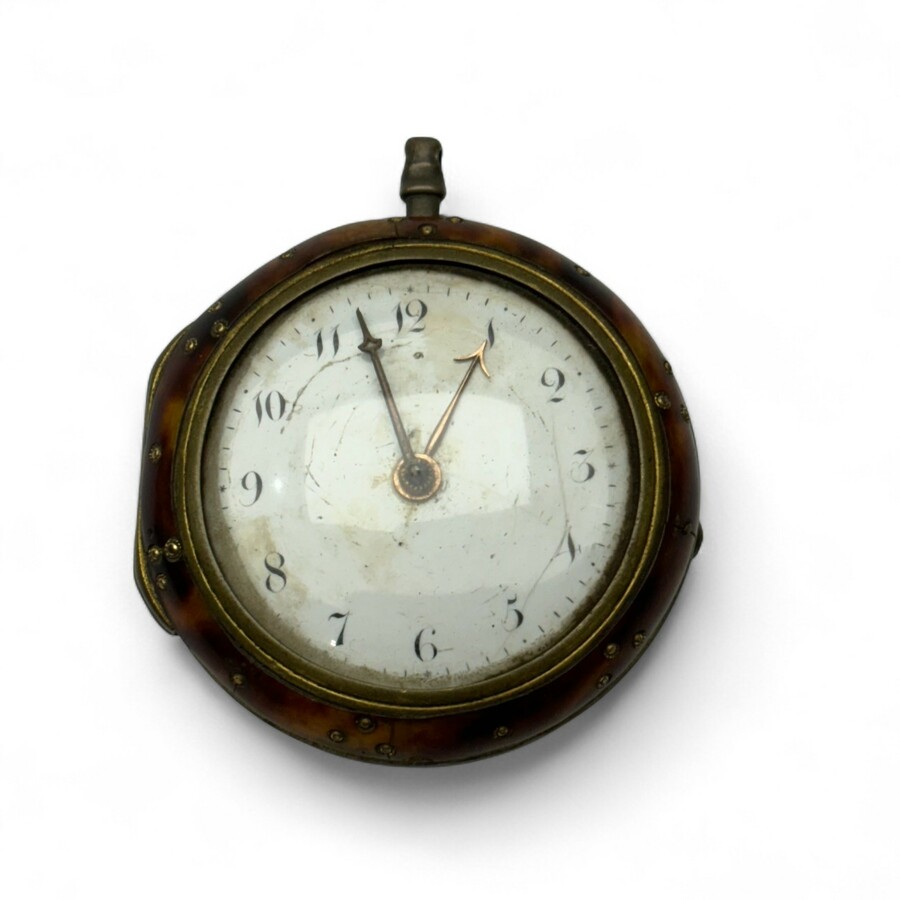 Een 18e eeuws zakhorloge, zgn. snek. Schildpad buitenkast, Engelse eerste gehalte zilveren kast. Uurwerk gemerkt 'Hobler & Son, London 2509'.