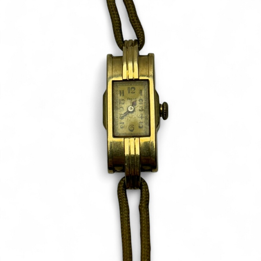 Een jaren '30 dameshorloge in 14 karaats (585/1000) geelgouden kast, op stoffen band, met gouden sluiting. Gemerkt 'Freco' op de wijzerplaat & '585' op de sluiting & binnenzijde kast.