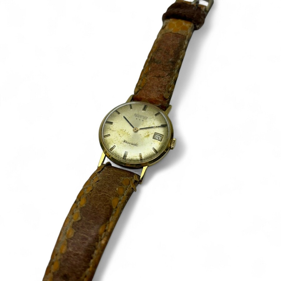 Een jaren ’50 14 karaats (585/1000) geelgouden Zwitsers herenpolshorloge aan een bruine lederen band. Merk Pontiac, model Memomatic