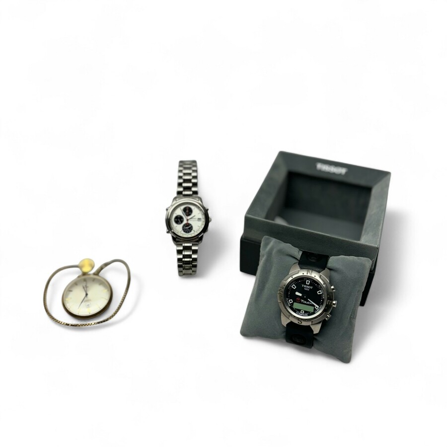Een 20e eeuws herenhorloge, Tissot Touch, model Z251 351, in origineel doosje. Met daarbij een herenhorloge op stalen band, Seiko Chronograph 7T32-6G43 en een verguld zakhorloge aan chatelaine