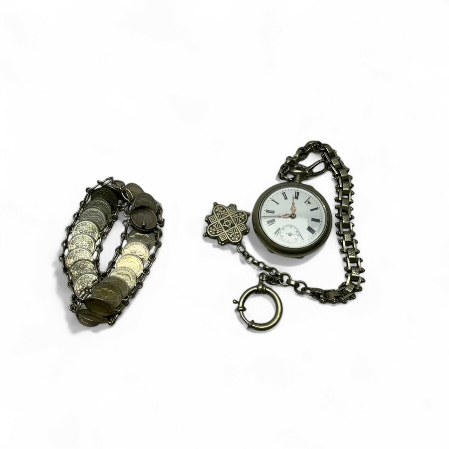 Lot divers: een zilveren armband gemaakt van zilveren dubbeltjes, Tweede Wereldoorlog (1941) en een nikkelen zakhorloge aan zakhorlogeketting, signet met hoefijzer en polostokken