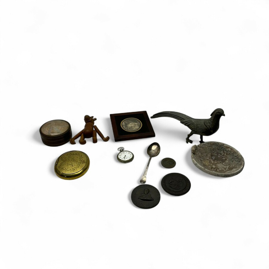 Lot diversen, waaronder een art deco sculptuur van een fazant (pootjes gelijmd), lijstje met 19e eeuwse kopergravure, Zenith zakhorloge, drie penningen, tabaksdoos gedateerd 1857, bodemvondst sc...
