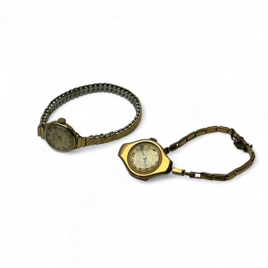 Twee 14 krt (585/1000) gouden dameshorloges aan vergulde flexibele banden. Merken: Kaiserstunde en Viking.