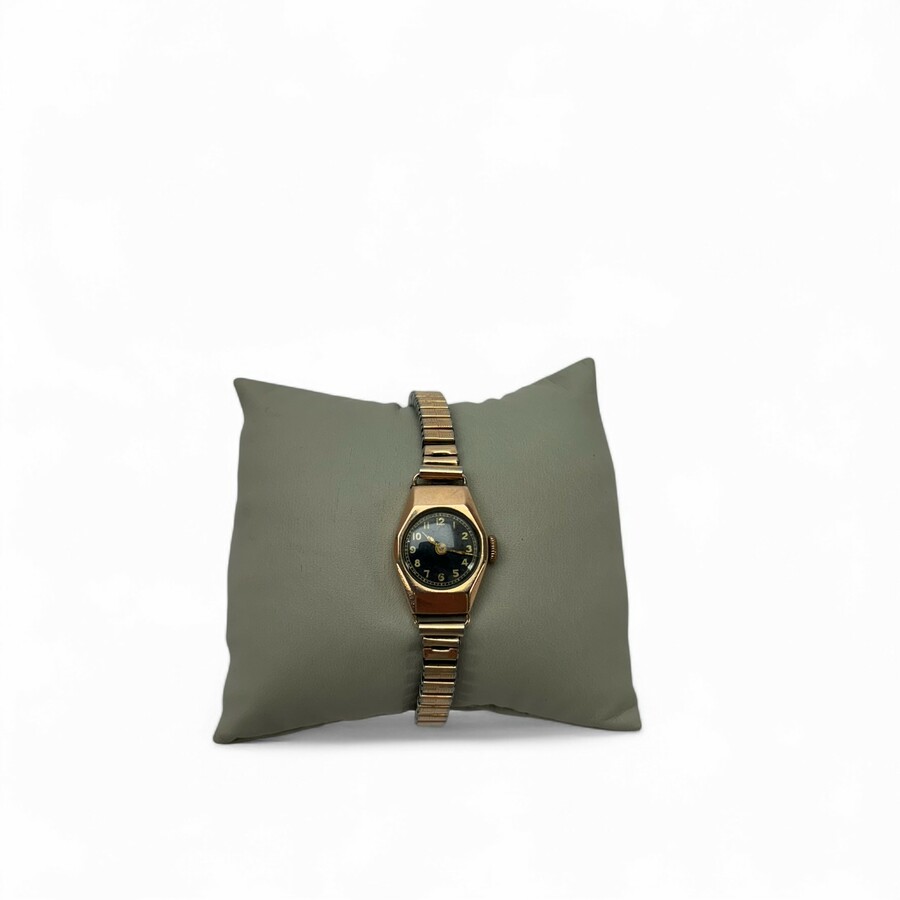 Een vroeg 20e eeuws Engels 9 karaats (375/1000) roségouden dameshorloge in zeskantige kast, op flexband