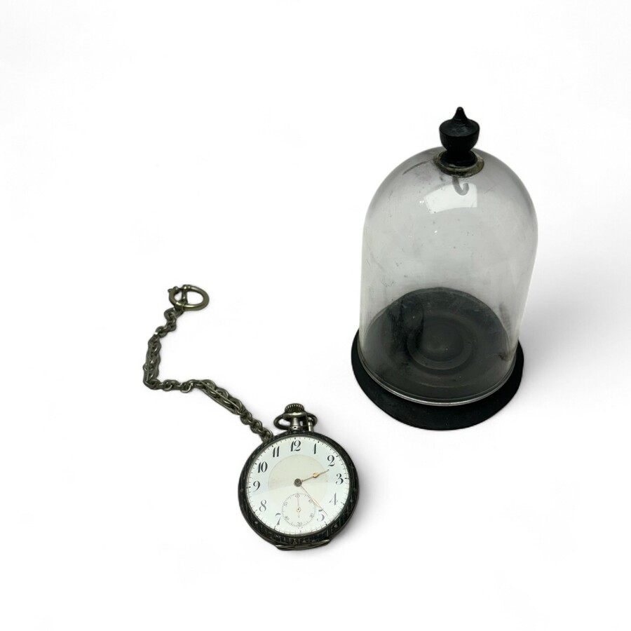 Zakhorloge in zilveren kast met niëllo decor, merkteken vervaagd, aan onedel horlogeketting