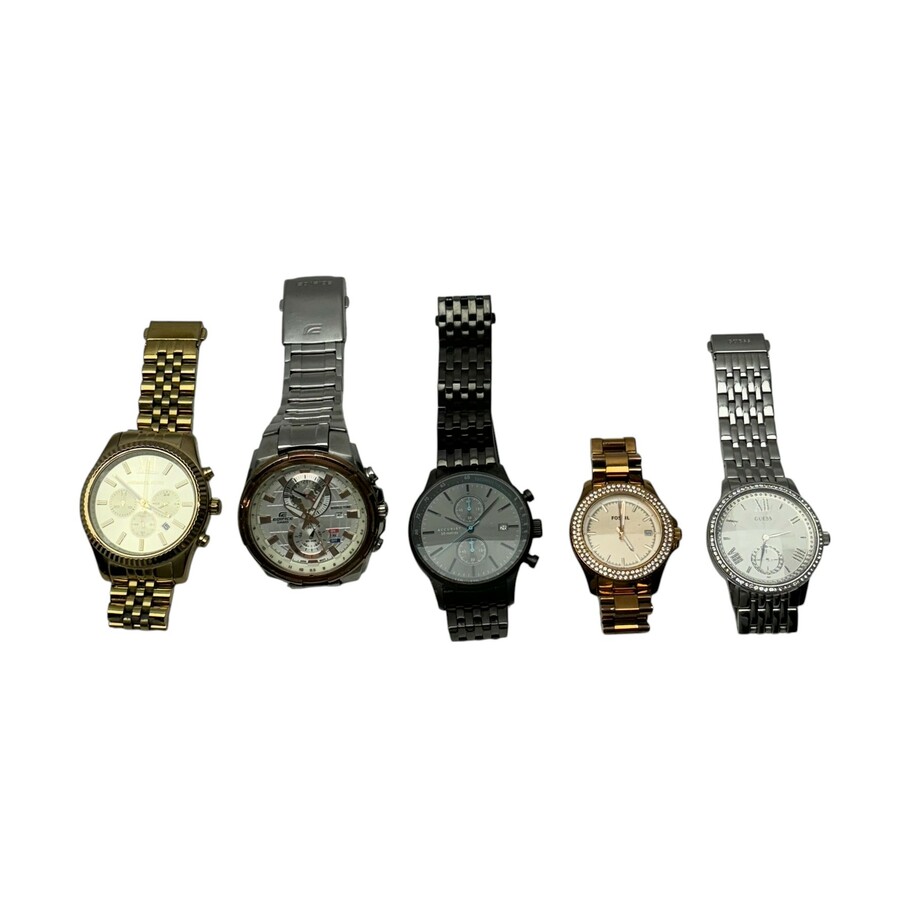Lot van vijf dames- en herenhorloges, Guess, Casio Edifice, Michael Kors, Fossil en Accurist