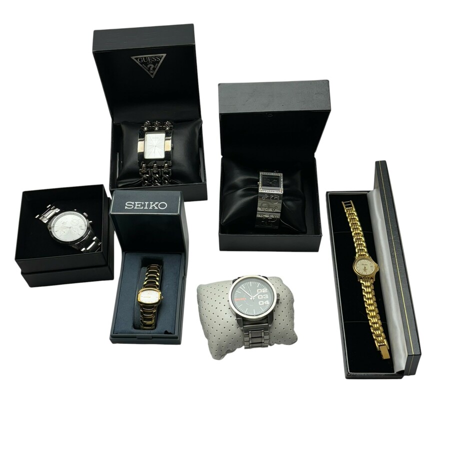 Lot horloges, veelal in doosjes. Diverse merken, o.a. Garonne, MC Chronograph, Diesel, 2x Guess en een verguld Pontiac dameshorloge