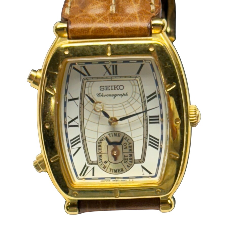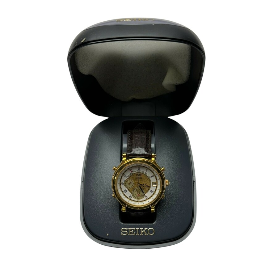 Een jaren '90 herenhorloge, Seiko Age of Discovery. Ref. 8M25-5000, op lederen Seiko band. In Seiko doosje.