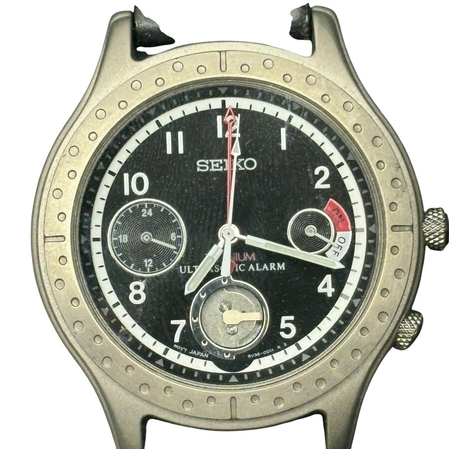 Een 20e eeuws herenhorloge, Seiko. Ref. 8V36-0010. Titanium kast, met Ultrasonic Alarm. In Seiko doosje.