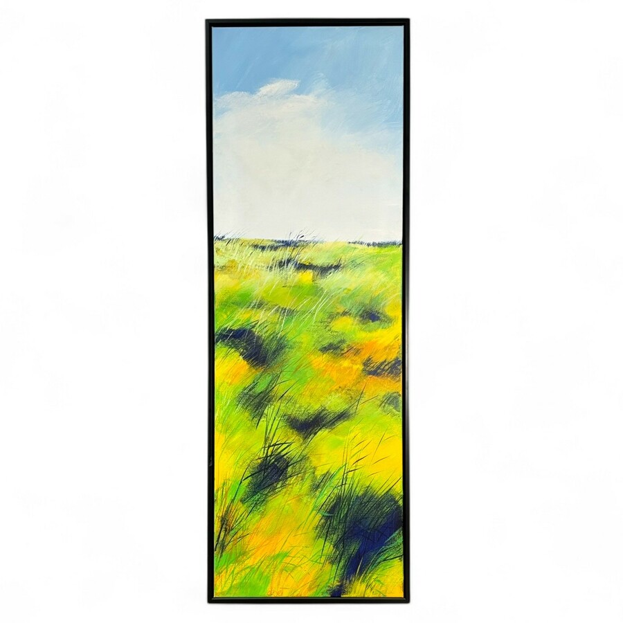Schilderij, acryl op doek. Fries landschap met gras en lucht, Leppedyk Akkrum. Rechtsonder gesigneerd ‘Doet’ = Doet Boersma (Wjelsryp, 1958), geschilderd in 2001. In baklijst.