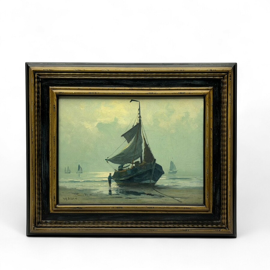 Schilderij, olieverf op paneel. Vissersboot op het strand, linksonder gesigneerd Henk Dekker (Gouda 1897 - Den Haag 1974), gedateerd 1927. Herkomst: kunstgalerie Arnold, 2005.