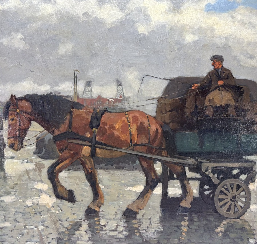Schilderij, olieverf op doek. Paard en wagens in de haven van Rotterdam. Rechtsonder gesigneerd Gijsbertus Johannes van OVerbeek (Dordrecht 1882 - Rotterdam 1947). Herkomst: kunsthandel Protecto...