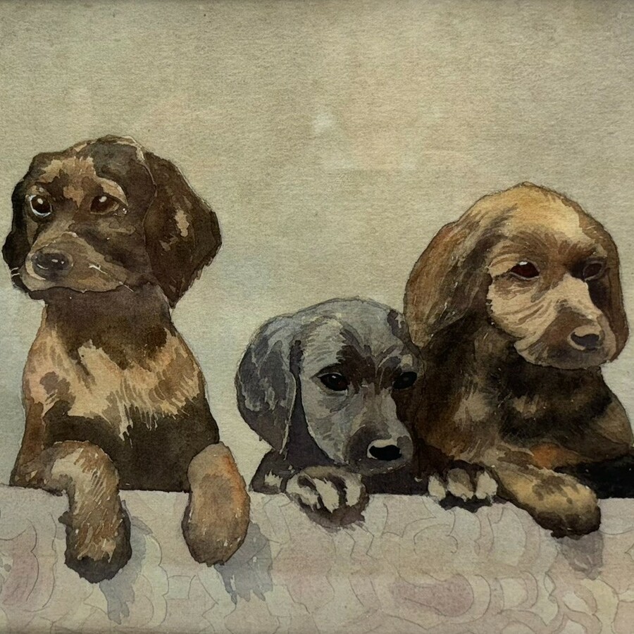 Aquarel op papier, voorstelling van acht puppy’s. Rechtsonder gesigneerd Jopie Huisman (Workum 1922 – Groningen 2000), gedateerd 1946. Herkomst: kunst- en antiekveiling Baerveldt IJlst, 20 maart...