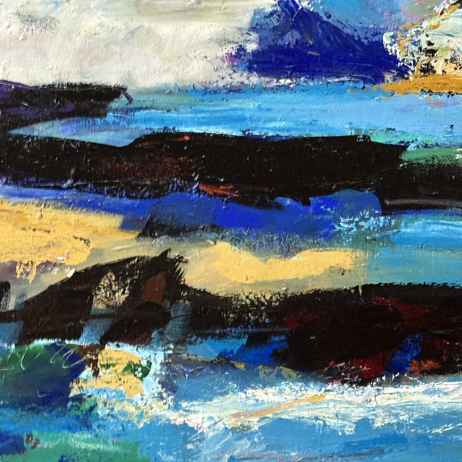Schilderij, olieverf op doek. 'Waterlandschap', rechtsonder gesigneerd Annemarieke Woltman (Utrecht 1959 - Leeuwarden 1997), gedateerd 1996.