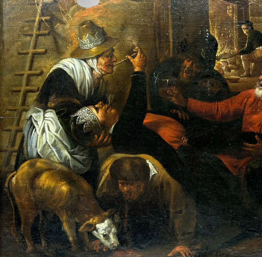 Schilderij, olieverf op paneel. Driekoningen. Ongesigneerd, school David Ryckaert 17e eeuw. Met aan de achterzijde 19e eeuwse labels 'H. Waite Carver and Gilder Manchester'. In zwarte profiellij...