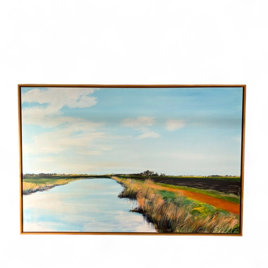 Schilderij, acryl op doek. Fries landschap met vaart op de achtergrond een dorp. Leppedyk, Akkrum. Rechtsonder gesigneerd ‘Doet’ = Doet Boersma (Wjelsryp, 1958), geschilderd in 2001. In baklijst...