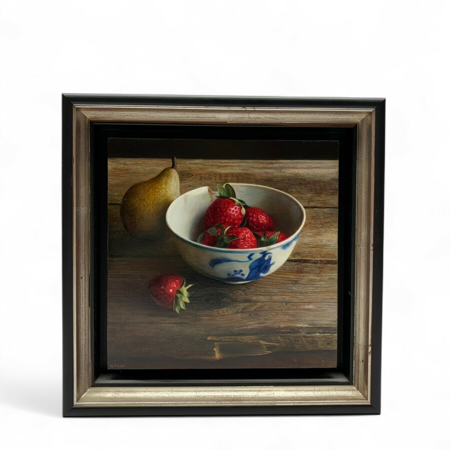 Schilderij, olieverf op paneel. 'Aardbeien met peertje', linksonder gesigneerd Herman Tulp (Zwolle, 1955). Herkomst: galerie Maya Wildevuur, 2003.