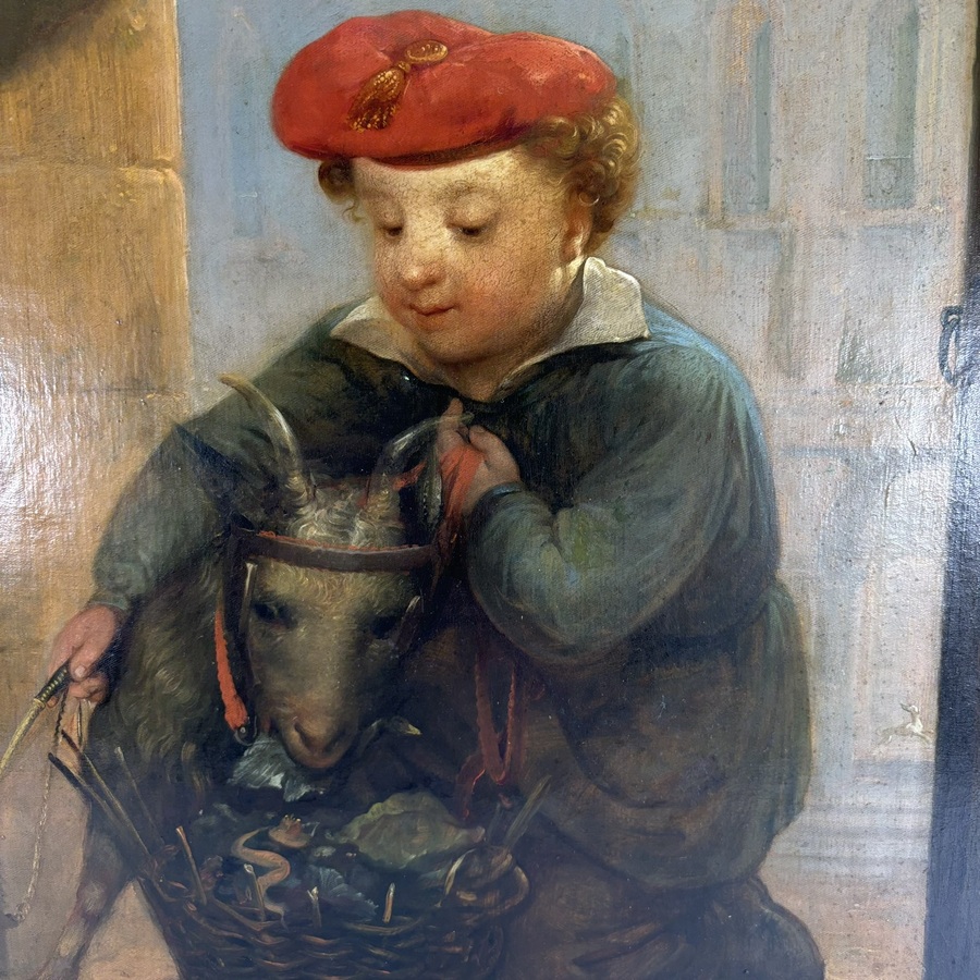 Schilderij, olieverf op doek. Kind met geitje in Italiaanse stad. Door Otto de Boer (Woudsend 1797 - Leeuwarden 1856). In vergulde ornamentenlijst, met label J.H. Brugman den Haag
