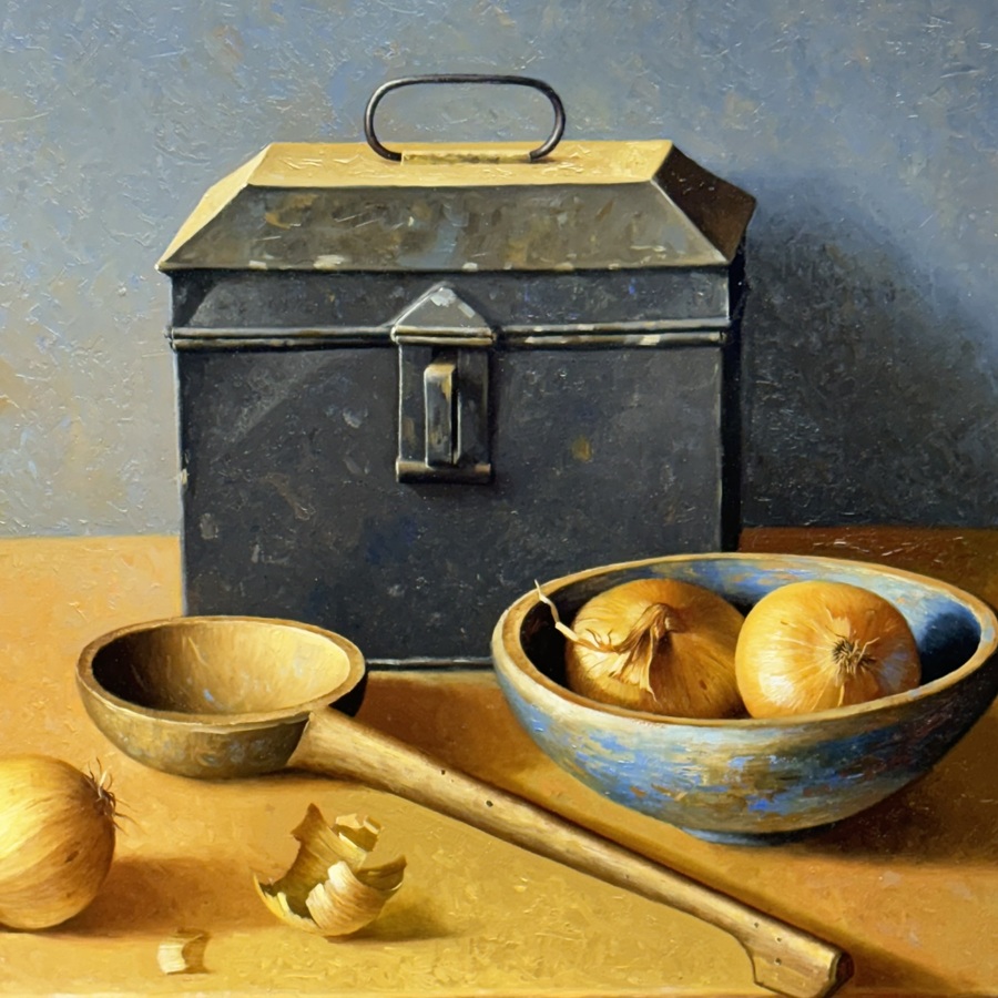 Schilderij, olieverf op paneel. Stilleven met blikken trommel, houten lepel, uien en blauw schaaltje. Rechtsonder gesigneerd Epko Cordel (Bolsward, 1957), gedateerd 1988.