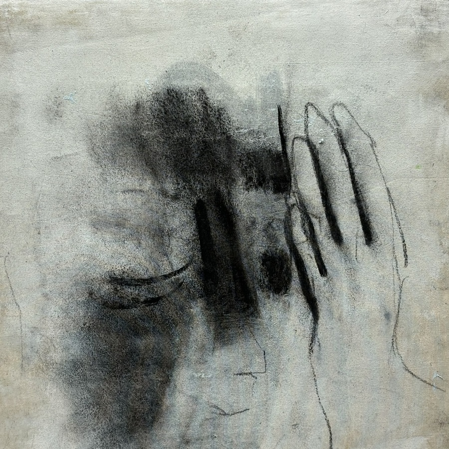 Gemengde techniek op doek, portret met hand. Door Krin Rinsema (Meppel, 1947). In houten baklijst.