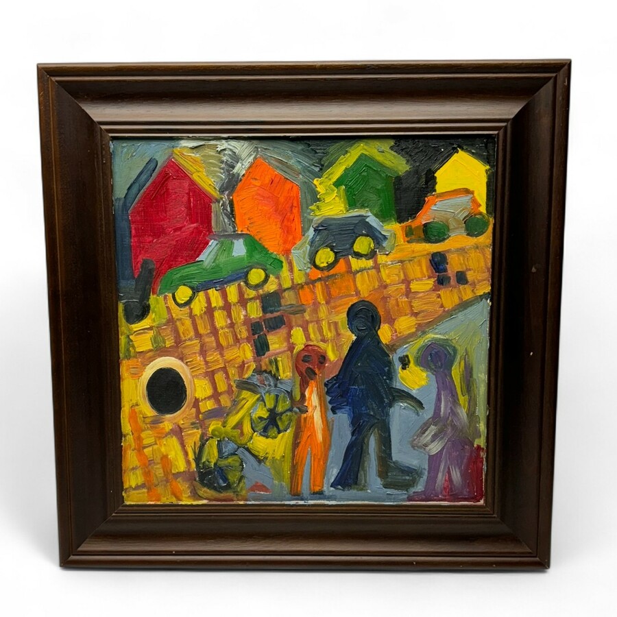 Schilderij, olieverf op paneel. Spelende kinderen, verso gesigneerd Wim Izaks (Eibergen 1950 - Enschede 1989), gedateerd 1987.