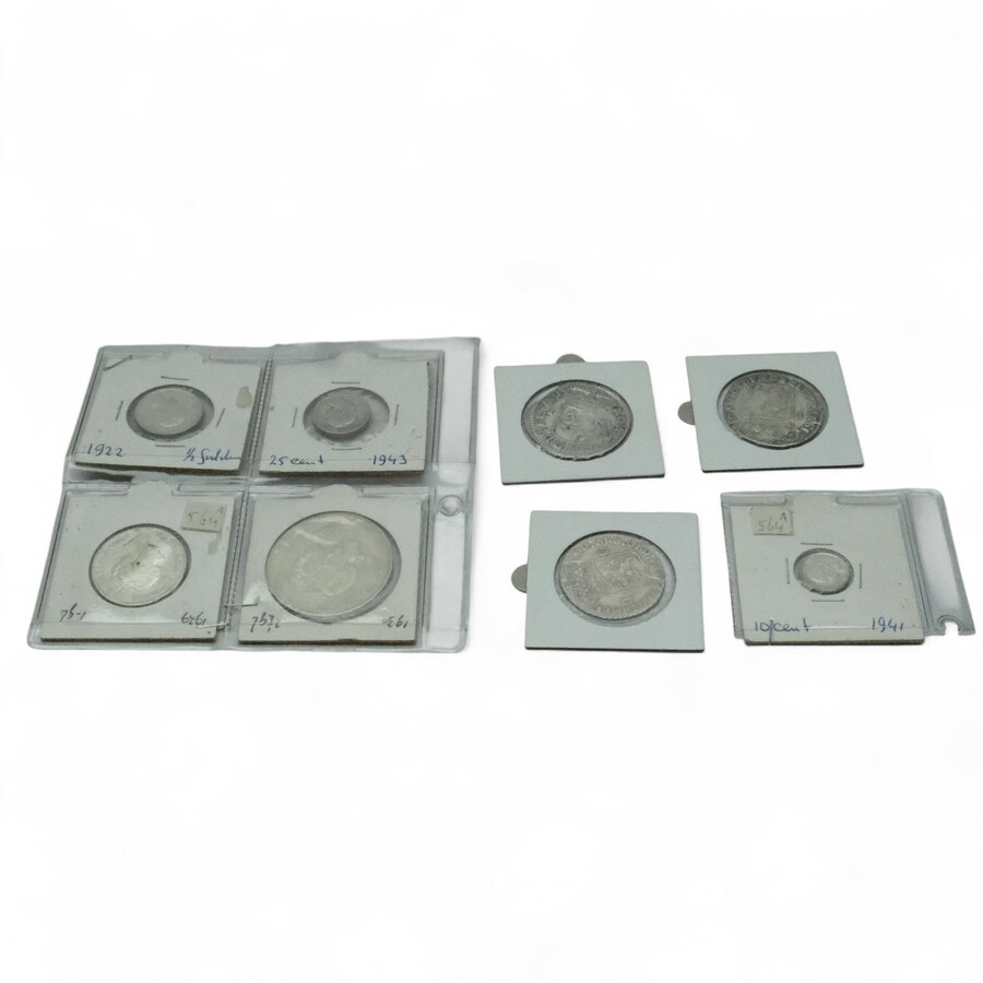 Lot diverse zilveren munten: 10 cent 1941, ½ Gulden 1922, 25 cent 1943, Rijksdaalder 1930 en Gulden 1929. Met daarbij drie 18e eeuwse munten: 1G Overijssel 1723, 1 G Holland 1794 en 1 G Utrecht ...