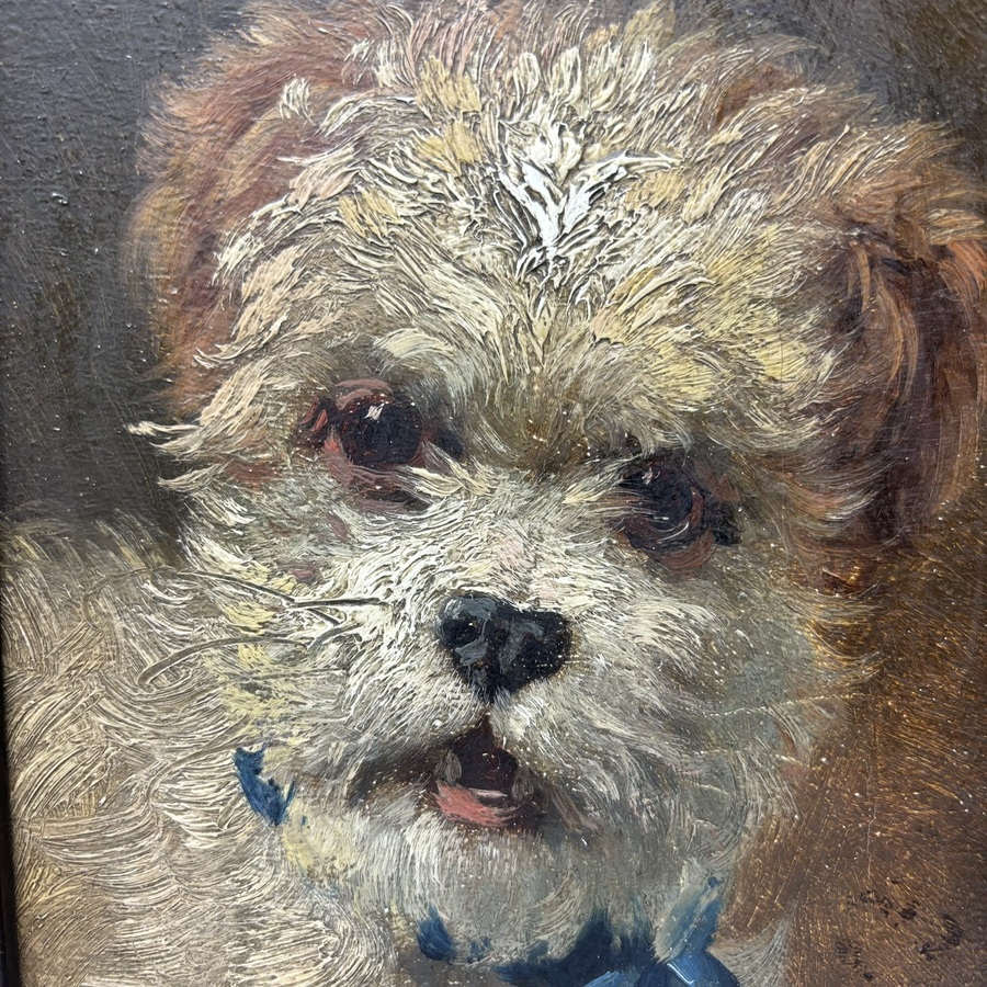 Schilderij, olieverf op paneel. Terriër met blauwe strik. Rechtsonder resten van monogram Otto Eerelman (Groningen 1839 – 1926). Verso label kunsthandel Klamer, Guldenstraat Groningen