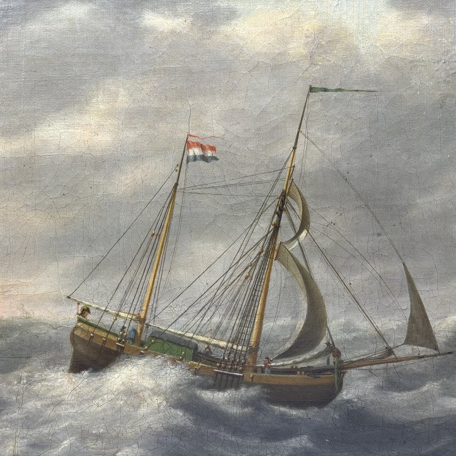 Een schilderij olieverf op doek. Drie schepen op ruwe (Zuider) zee. Toegeschreven aan Dirk Piebes Tjollema (1760-1840). In potlood op de achterzijde.