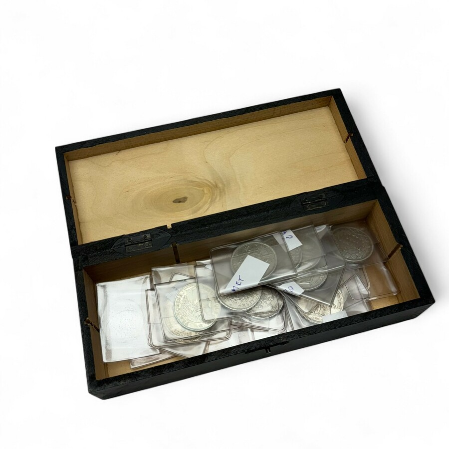 Houten kistje gevuld met veertien Franse zilveren 5 Franc munten: 1843 B (Louis-Philippe I), 2x 1849 A (Republique Francaise) en diverse jaartallen Napoleon III: 1867 A, 1868 A, 1869 B, 1870 B, ...