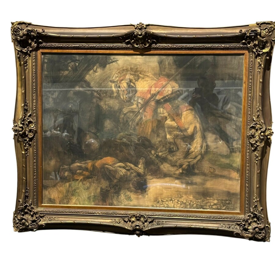 Grote krijttekening op papier, voorstelling van drinkende strijder en paard. Rechtsonder gesigneerd Johannes Hendricus Jurres (Leeuwarden 1875-Amsterdam 1946)